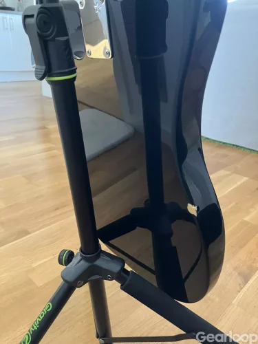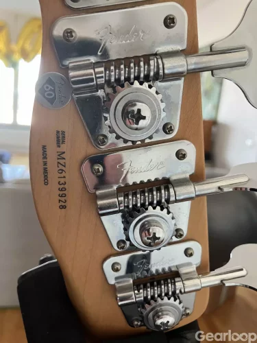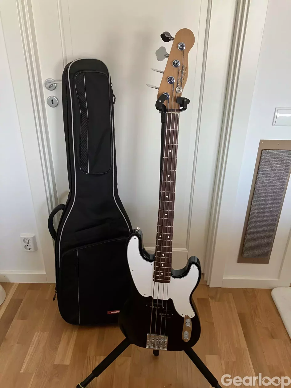 Basen är strängad med flatwounds. Jag skickar med en uppsättning oanvända Fender roundwounds, plektrum och en insex-nyckel för intonering och justering av stränghöjd.