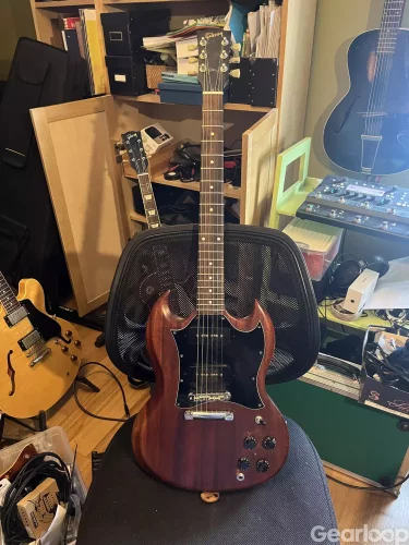Tidigare ägare har routat för en extra mick, men hade nuvarande konfig. när jag köpte den. Det sitter 2 st Tonerider P-90’s i den som jag verkligen inte behövt byta. Lätt o fin ,obruten hals m 50’s profil. En fröjd att spela på, låter skitbra men jag har för mycket grejer.