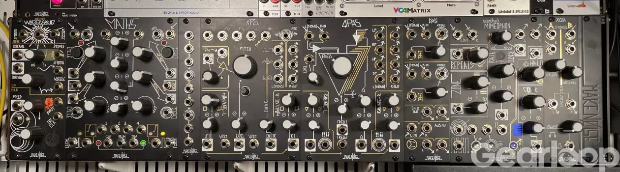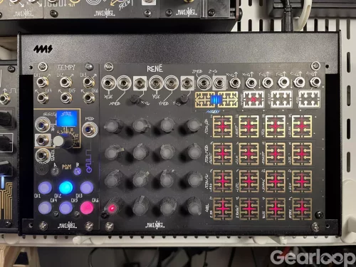 Ett helt igenom Make Noise stereo-system i 104 hp case med Tempi och René II i eget case vid sidan av.