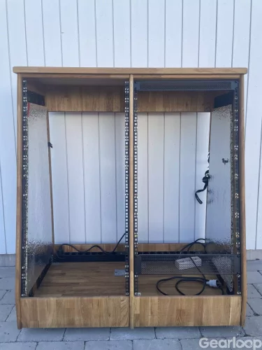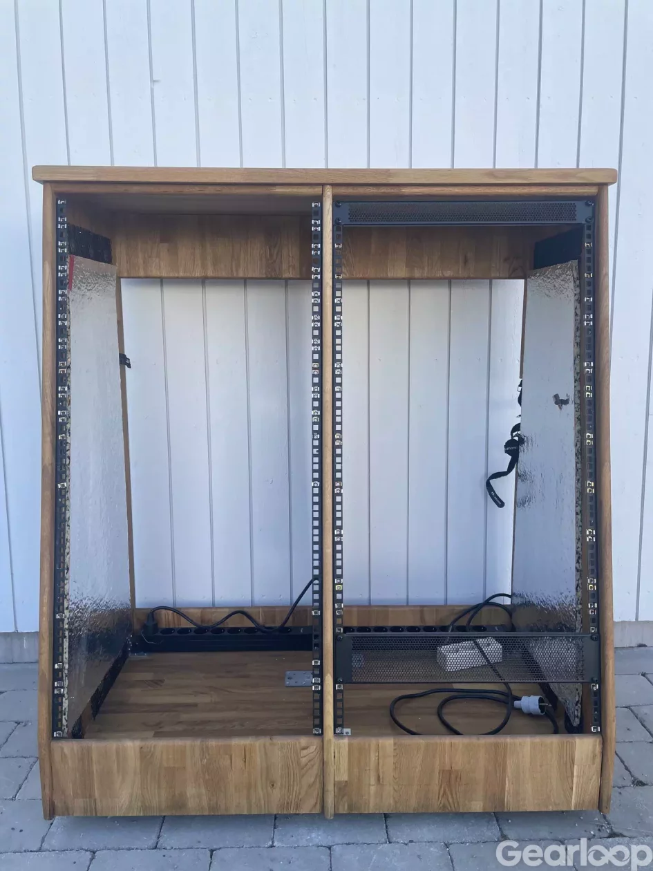 Snickeribyggt studiorack med dubbla fack på vardera 22 höjdenheter / Units.