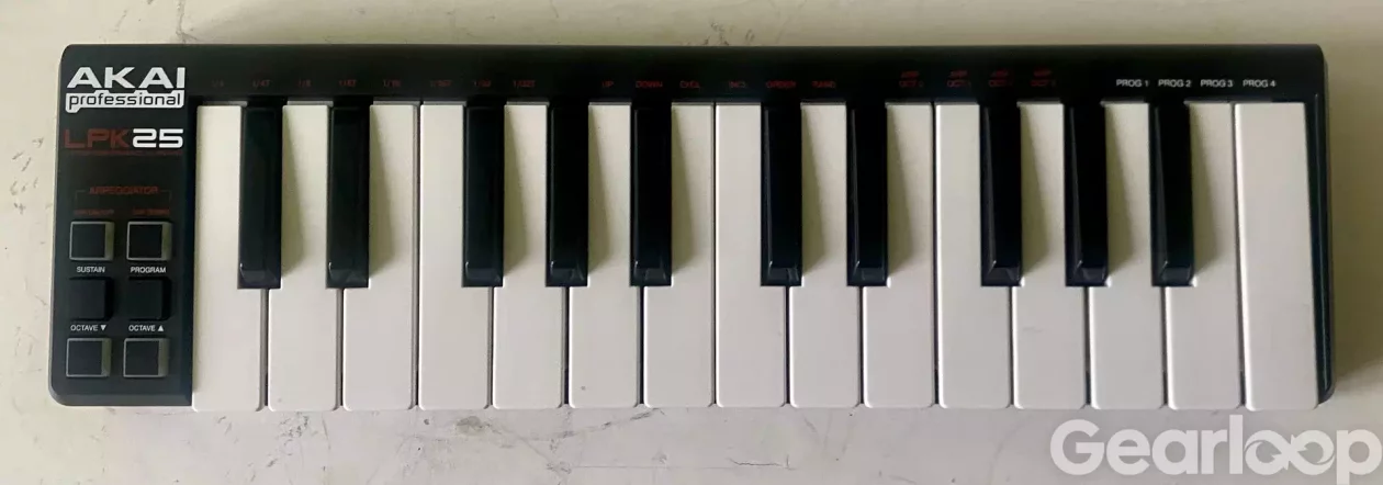 Akai Professional LPK25 är ett MIDI-keyboard med 25 anslagskänsliga minitangenter. Det är utformat för att vara portabelt och enkelt att integrera i en mobil musikproduktionsuppsättning. Keyboardet har en inbyggd arpeggiator med olika lägen och tidsdivisioner, samt knappar för sustain, oktav upp/ner och programval. Anslutning sker via USB. För att använda programfunktionen behöver man ladda ner LPK25 editor från Akai Pros hemsida vilket är gratis, jag har dock aldrig använt den till det utan bara haft den som keyboard för ljudbanker i logic. USB-sladd medföljer ej.