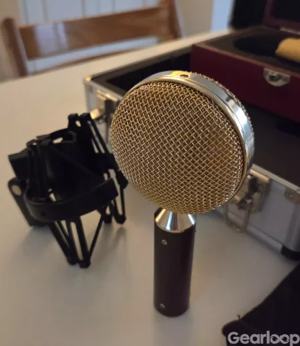 Bandmick Cascade Fathead (gen 1, S/N 9799) med hållare och väska. Endast en ägare och förvarad stående för att undvika bandtöjning. Funkar perfekt, rund ton som sig bör och dessutom fantastisk lågbas, gör sig kanon t.ex. framför ett trumset av den anledningen. Kräver en del av preampen som de flesta bandmickar.