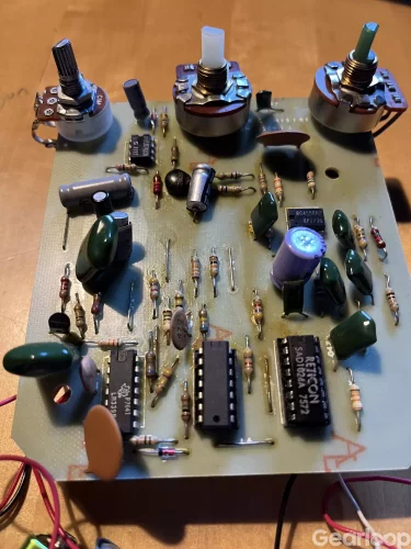 - Alla komponenter verkar vara original vad jag kan bedöma, förutom "Rate- potentiometern" som jag har ersatt med en Alpha "reverse log" med samma specifikationer som originalet men annat utseende. Skaftet har därför modifierats för att passa ratten. Originalet medföljer om så önskas men är i princip omöjlig att reparera enligt min bedömning. CTS tillverkar ej längre dessa potar enligt expertisen på nätet. Skruvarna till höljet är inte heller original.