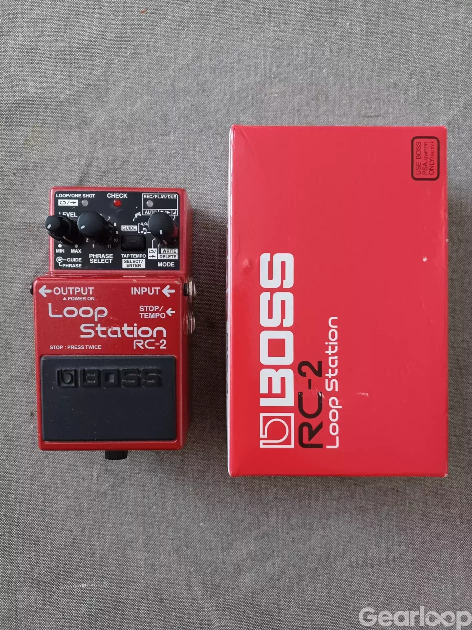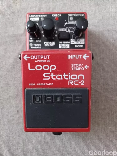Boss RC-2 Loop Station effektpedal för elgitarr eller andra instrument. Kompakt loop-pedal i röd färg med in- och utgångar på ovansidan. Pedalen har reglage för nivå, tempo och olika loop-lägen samt inbyggda rytmer. Drivs vanligtvis med 9V-nätadapter eller batteri (beroende på modellens standard). Passar för musiker som vill spela in, lagra och spela upp loopar i realtid vid övning eller livebruk.