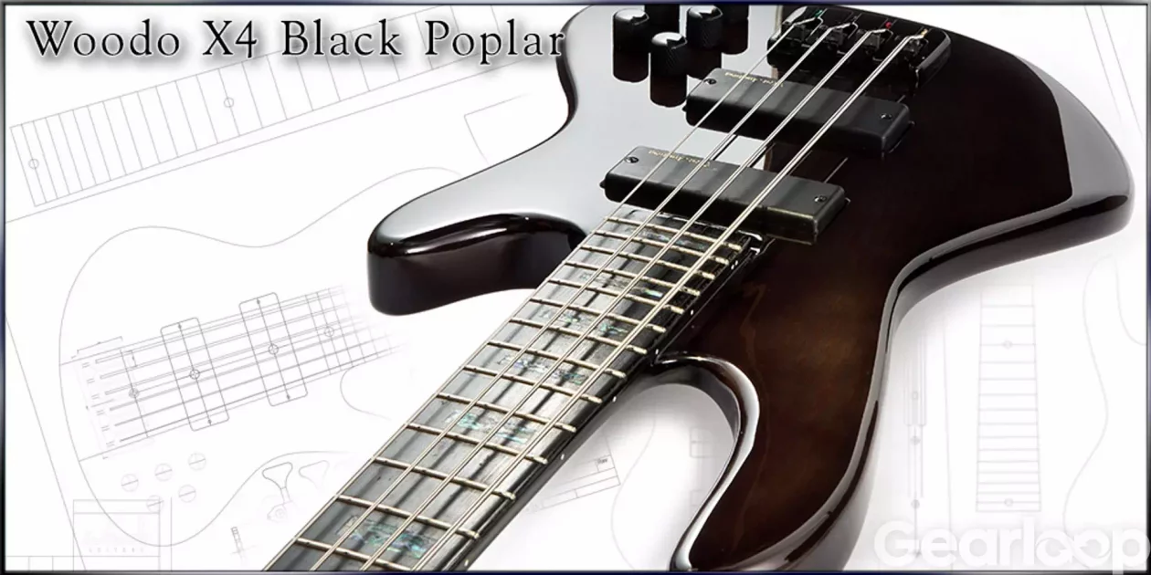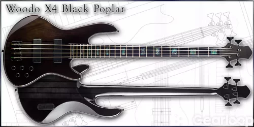 Läcker Woodo 4-strängad basmodell. Transparent svart alkropp med poppel-topp och genomgående lönn/palisander hals med block inlägg av blå abalone. Skön och snabb hals. Aktiv 9 volts elektronik med 3-vägs EQ.