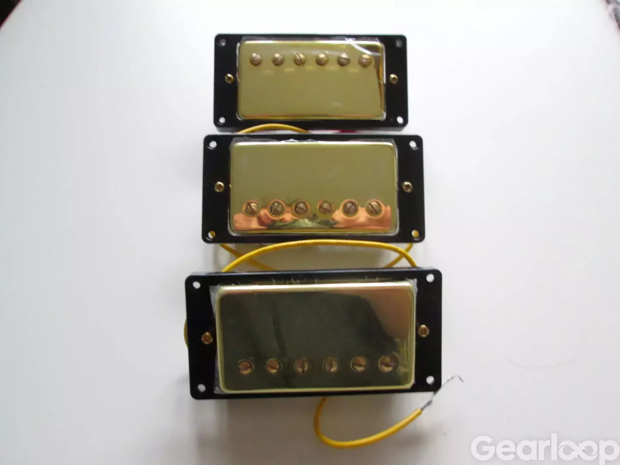 Humbuckermickar,3st med guldkåpor. Helt nya. Skyddsplasten kvar. Asientillverkade. Micksarg följer med. Stallmick :11,84 Kohm,mitten: 8,12 Kohm och hals : 8,11Kohm.Säljer alla 3 tillsammans 475kr plus frakt.