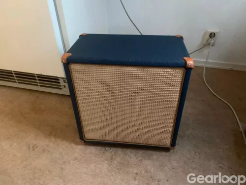 Blå högtalarlåda med snygga detaljer som hörn i skinn och matchande handtag. Måtten är (HxBxD) 44 x 42 x 24 cm. Elementet som sitter i är ett Peavey 12 tums Blue Marvel (8 ohm). Kan skickas eller tas till Stockholm