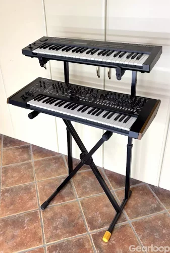 Gediget och stadigt stativ i två våningar för keyboard eller synthesizer. Fint skick, endast stått still i studiomiljö. Nypris runt 1200 kr.