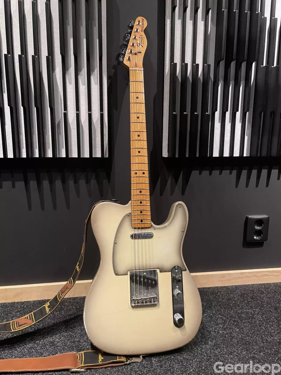Ett riktigt bra exemplar av 70tals-tele i en ovanlig finish med samlarvärde. Ombandad runt 2018 så den är en riktig player. Har även bytt jacket till ett som sitter kvar då originaljacket hoppade ur kroppen hela tiden. Askkopp och original outputjack finns i case förstås. Kommer med ett stilrent Warwick rockcase som förstås inte är original men som ser likadant ut som originalcaset. Den har ett riktigt grymt och "direkt" tele sound så som man vill att en tele ska ha, delvis pga 1 meg-pottarna som kommer som original i Fender Telecasters från denna tid. Gitarren är inte supertung för att vara 70-talare, den väger typ som en ny Mexiko-tele som jag också har. Jag ska väga gitarren och uppdatera annonsen asap. Kan testas i min lokal på Söder genom en underbar Insulander-stärkare!
