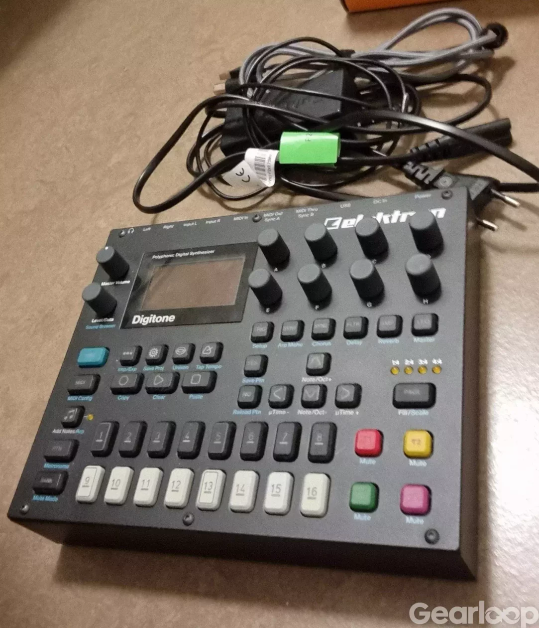 Digitone i orginalkartong samt psu och usb-kabel. Fungerar precis som den ska. Några knappar börjar bli slitna/sticky button men fungerar ändå, annars går det att skaffa nya från elektron.