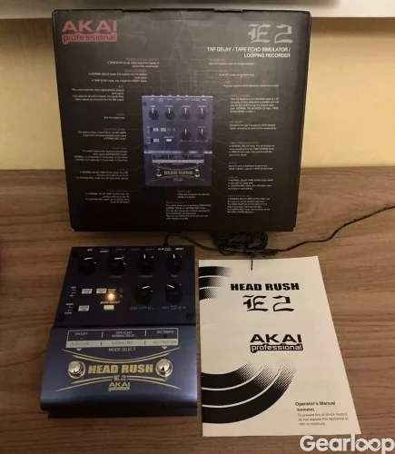 The Akai Headrush E2 is a versatile 16-bit digital delay, tape echo, and looping pedal featuring three modes (Normal Delay, Tape Echo, Looping), with up to 23.8 seconds of delay time and 35.6 seconds of loop time. It offers tap tempo, four individual head outputs for tape simulation, and a durable metal chassi with 9V DC operation.