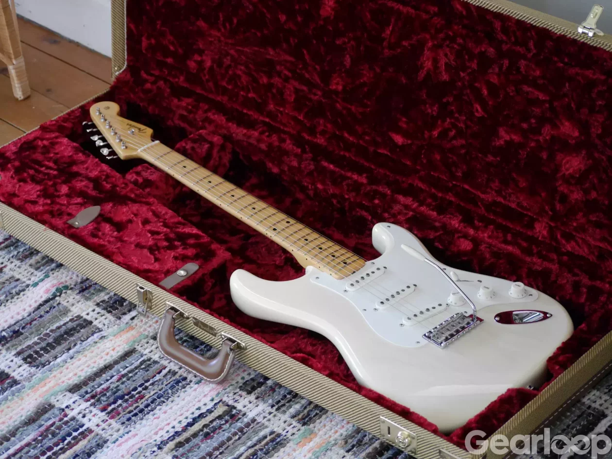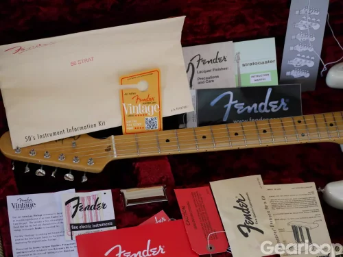 Lätt och välljudande strata med see-through-blonde finish och riktigt skön hals som kallas “soft V”. Den här ganska sällsynta varianten kom efter AV57 och ersattes sedan av American Original 50’s. Spelar fint utan fret-buzz. Knappt något bandslitage alls.