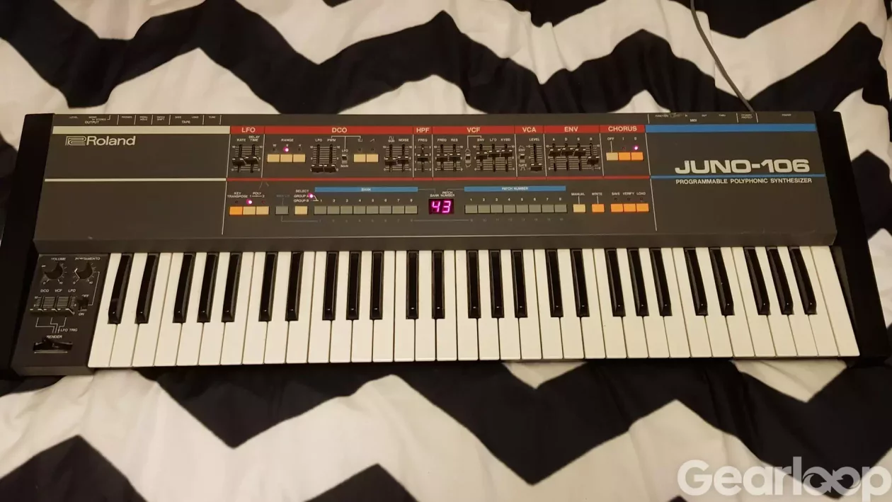 Roland Juno 106, klassisk analogsynth från 80-talet med midi, varma ljud och en legendarisk choruseffekt säljes till kanonpris pga platsbrist och flytt.