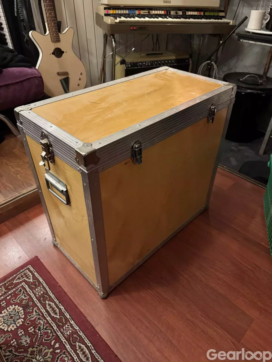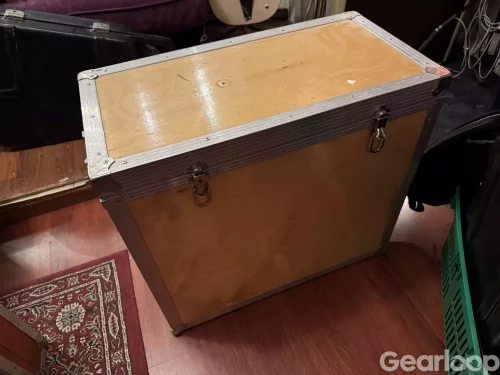 Trälåda/flightcase med förstärkningar och kanter i metall. Utrustad med låsbeslag och bärhandtag på sidan. Passar för förvaring eller transport av utrustning och tillbehör där ett stabilt yttre skydd önskas. Har själv använt den till förstärkare på turné.