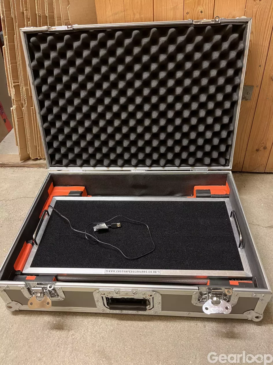 Pedaltrain 3 tour case i fint skick, bara lite limrester från gamla klistermärke på ovansidan. Innermått: (B x D x H): 62 x 42 x 16,5 cm, den väger 9 kg. Modifierad med skum och rörisolering ämne tejpad med riktigt gaffertejp på kanterna, botten och ena sidan för att det platta pedalbordet ska sitta tajt och stabilt. Det går såklart att återställa till originalspecifikation. Kostar ny (med tillhörande aluminum pedalbord) 2990kr +frakt i hos tysken.