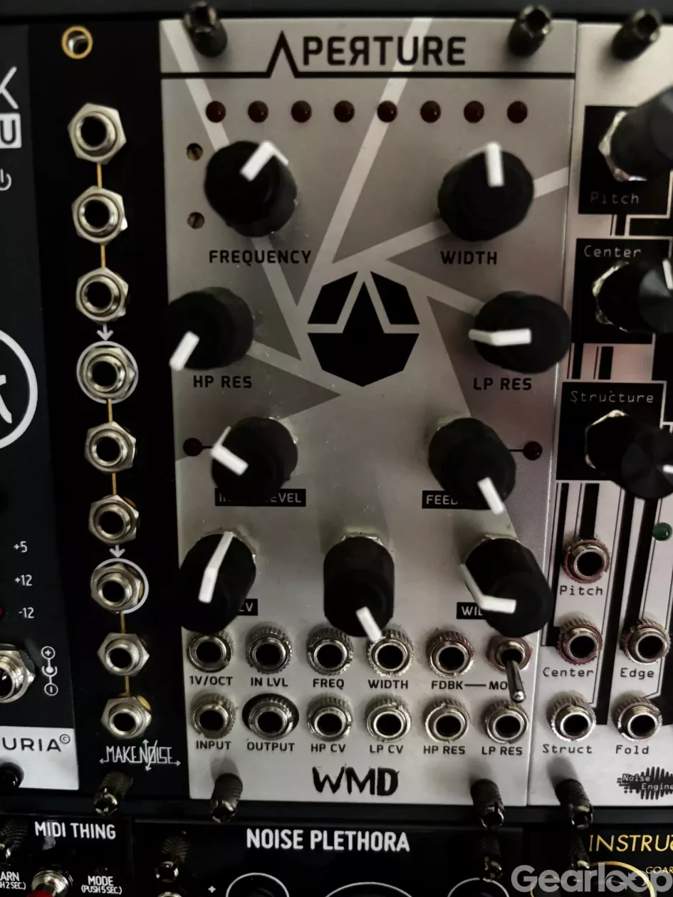 WMD Aperture — Variabelbredd bandpassfilter med åttapoligt filterkärna och separat resonanskontroll för hög- och lågpassdelarna. Kapabel till allt från subtil EQ till självoscillation och syrlig acid. Sista exemplaren såldes slut under 2024. 1500kr