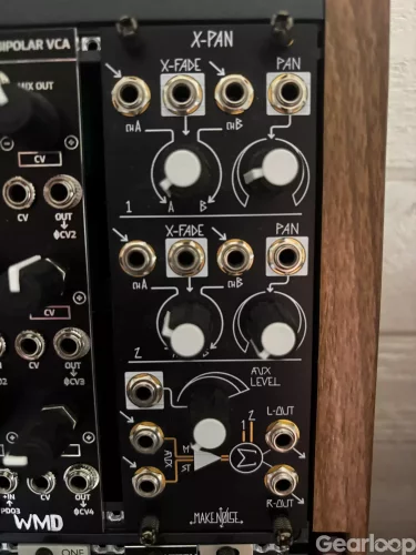Make Noise X-Pan — Femkanalig spänningsstyrd stereomixer i bara 10HP. Två kanaler med crossfader och panorering via CV, plus en aux-ingång. Kan även köras i audiofrekvens för sidebandeffekter. 1300kr