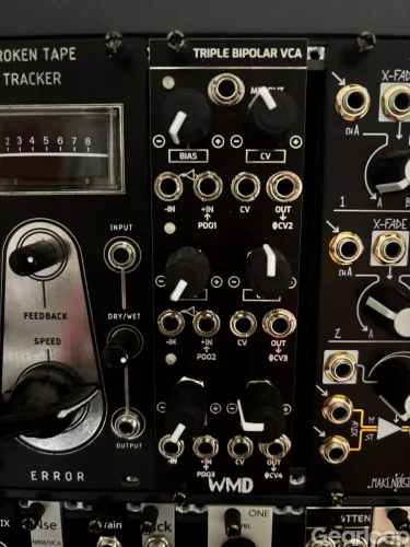 WMD Triple Bipolar VCA — Tre bipolära VCA:er i ett kompakt 8HP-format. Till skillnad från vanliga VCA:er kan den invertera signalen vid negativ CV, vilket ger djupare och mer expressiv amplitudmodulering. 1200kr