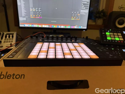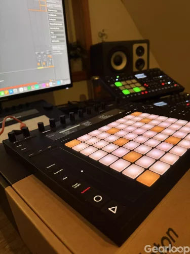 Ableton Push 2 midi-kontroller i svart utförande. Enheten har en 8x8 pad-matris med bakgrundsbelysta, tryckkänsliga pads samt reglar och knappar för styrning av musikprogram. Kontrollen är avsedd för användning tillsammans med dator och musikmjukvara, exempelvis för inspelning, arrangering och liveframträdanden.