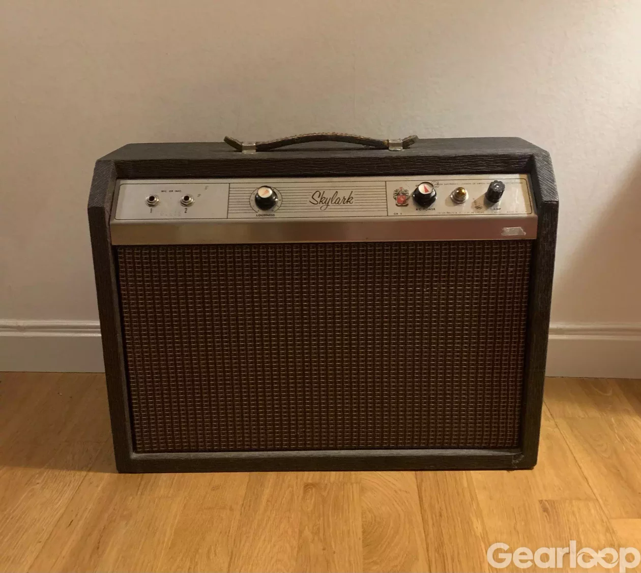 Gibson Skylark GA-5, troligen från 1963. Runt 5 watt, 10” högtalare (bytt till Jensen, original finns). 110 volt men trafo medföljer.