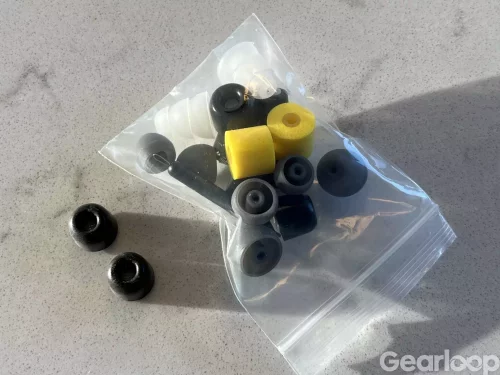 Förvaringsfodral samt oanvända hylsor/proppar medföljer (2 par svarta skum, 3 par grå silikon, 1 par med flänsar, 1 par gula). 1 par skumhylsor (M) är använda/förbrukade.