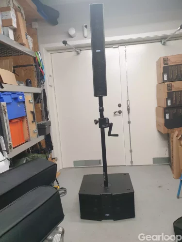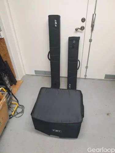 FBT Vertus system med sex basar (CLA208) och fyra toppar (CLA604), två distanser mellan bas och topp samt två beslag för att fästa topparna på dansbandspinnar. Det går att ha allt i ett system eller dela upp det i två system med en eller två basar och en topp. Alla enheter har fodral. Två av basarna har låsbara länkhjul.