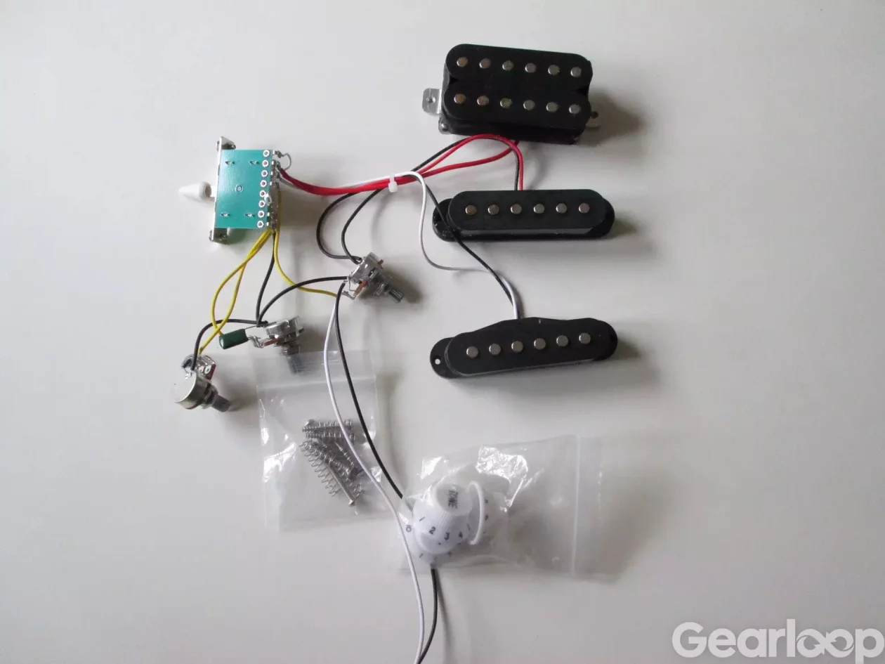 Mickset för strata. Humbucker och 2 singelcoils. Kpl med skruv,fjäder,pottar,mickväljare enligt bild. Asientillverkad. Pris 400kr plus frakt.