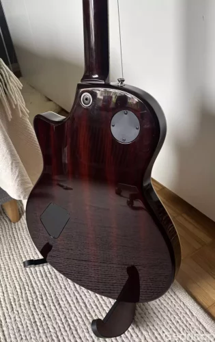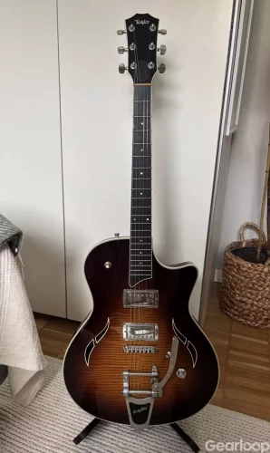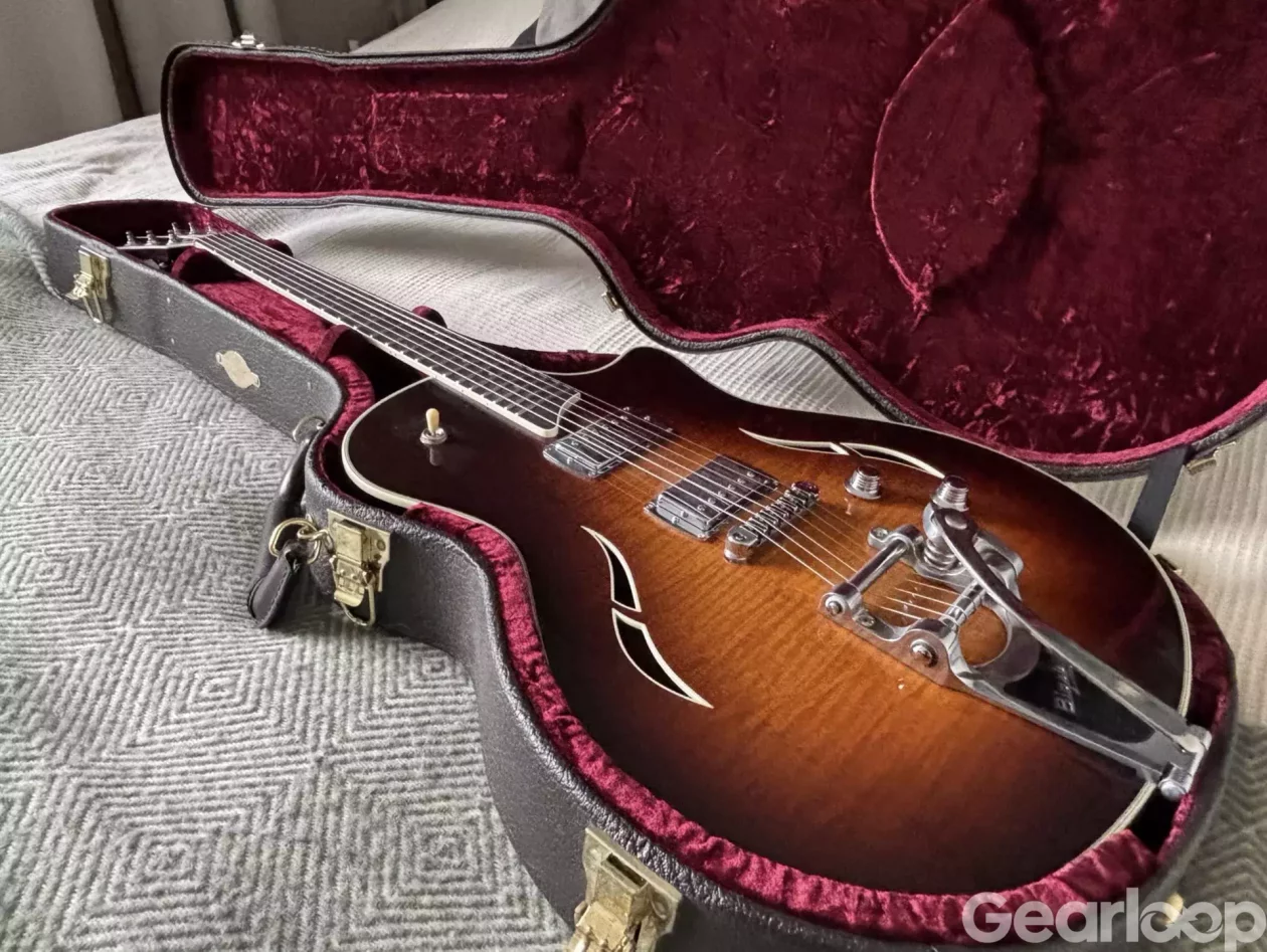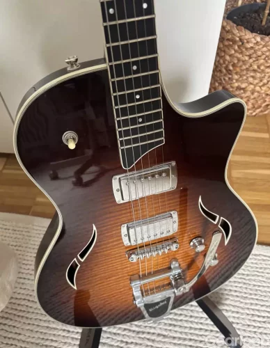Gitarren har en flammad lönntopp i sunburst-finish, två f-hål och en semi-hollow konstruktion med centerblock, vilket ger ett resonant, öppet och dynamiskt ljud men samtidigt bra sustain. Den är utrustad med Bigsby vibrato och roller bridge för mjuka vibratoeffekter och stabil stämning.
