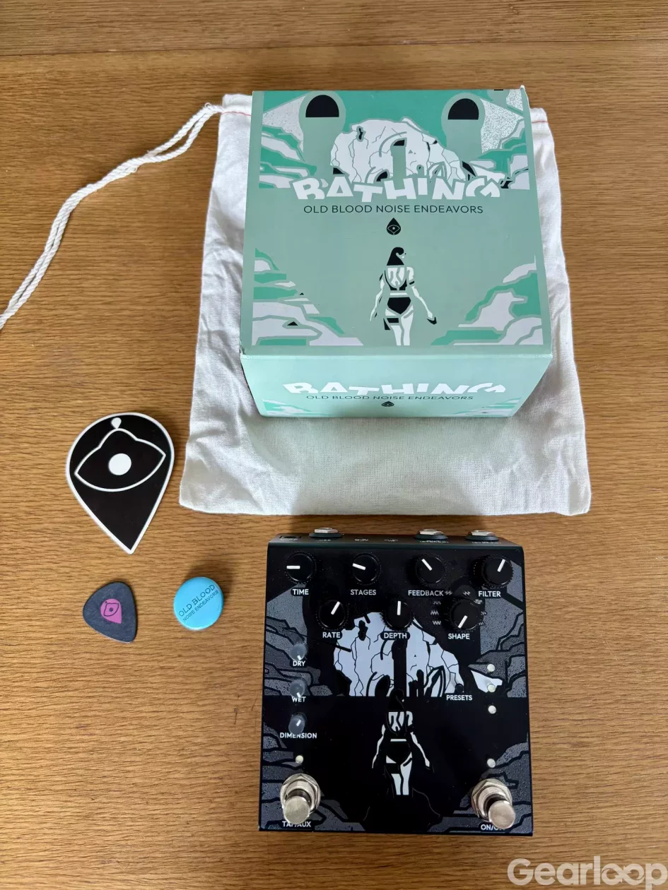 "Bathing is a liminal delay: perhaps a reverb, or a phaser, or a classic delay, but never exactly any one of these things. It’s a style of effect unique to the Old Blood lineup. You pick the overall delay time, the number of allpass filter stages it runs through to get there, and how you want to modulate the character of those stages. Turn knobs, fear not, and be sure to save that preset when you find it!
