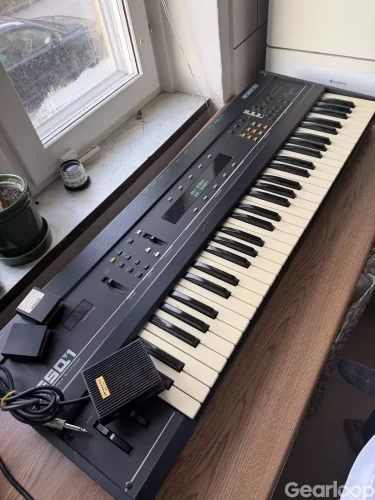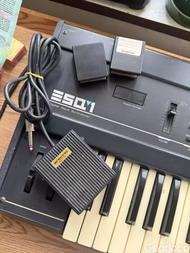 Ensoniq esq-1 med 2 kassetter och tillhörande pedal. Helt sjukt mycket synt och ljud för pengarna enligt mig.
