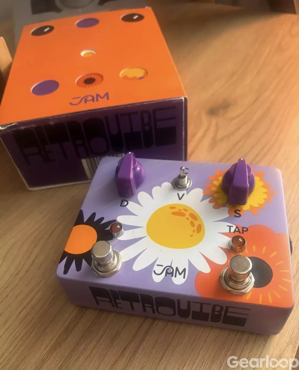 JAM Retrovibe gitarrpedal. Pedalen har reglage märkta D, V och S samt TAP-funktion, två fotomkopplare och lysdioder för statusindikering. Levereras med originalkartong i matchande design.