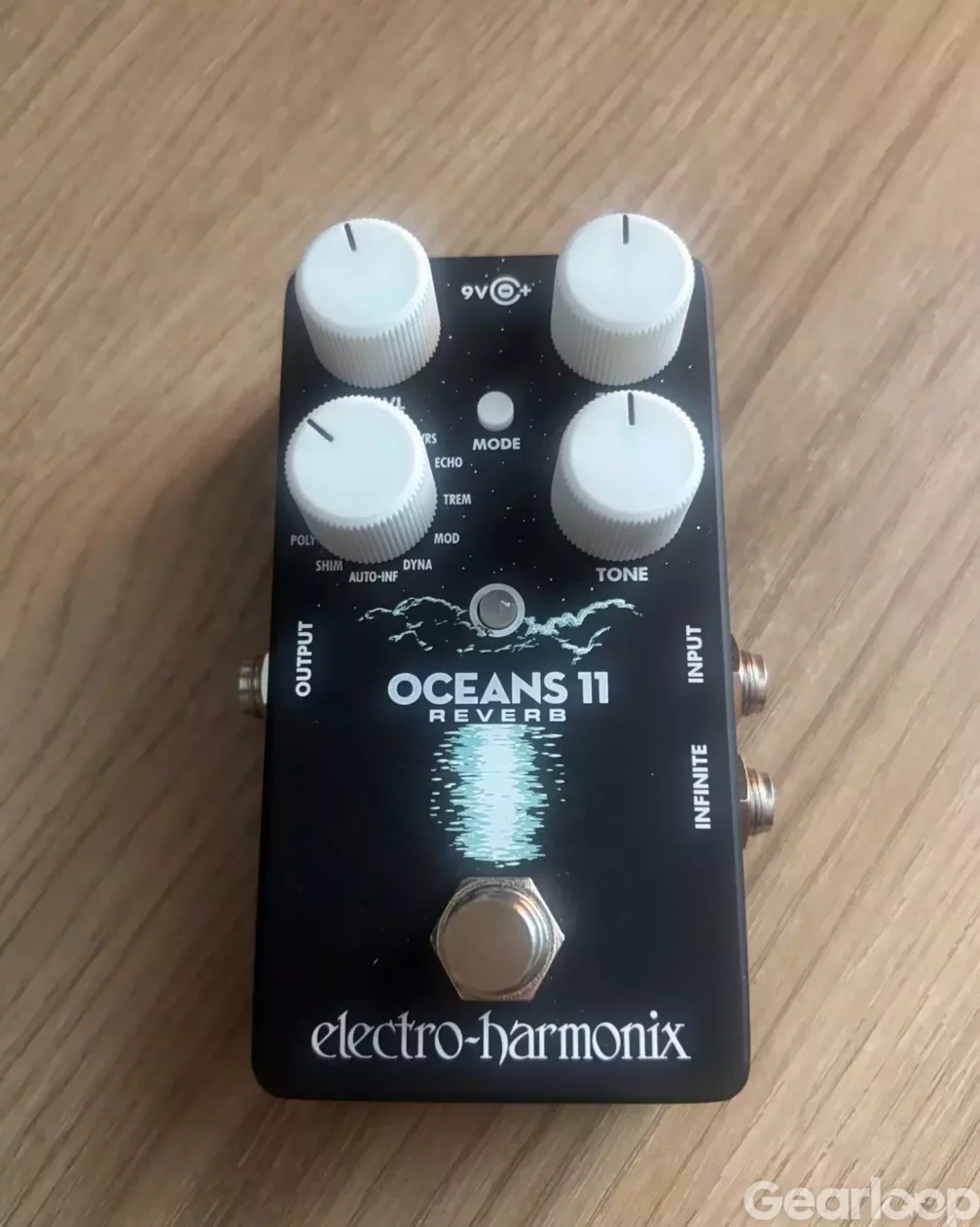 Electro-Harmonix Oceans 11 reverbpedal för elgitarr. Pedalen har flera olika reverbtyper som kan väljas via reglage på ovansidan. Utrustad med kontroller för bland annat nivå, ton och reverbparameter. Svart hölje med vita rattar och fotomkopplare på framsidan. Anslutningar för in- och utgång på sidorna samt strömanslutning på ovansidan.