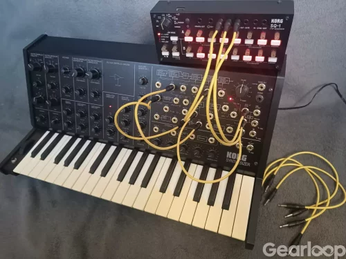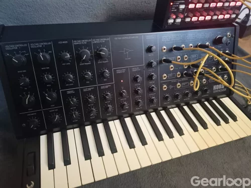 Ojämt gulnade tangenter, ser ut som mina råttor pissat på dom men så är icke fallet. Den låter dock så elakt som den ska. Extra skoj med SQ-1 inkopplad. Dom gula orginal kablarna är med.