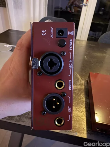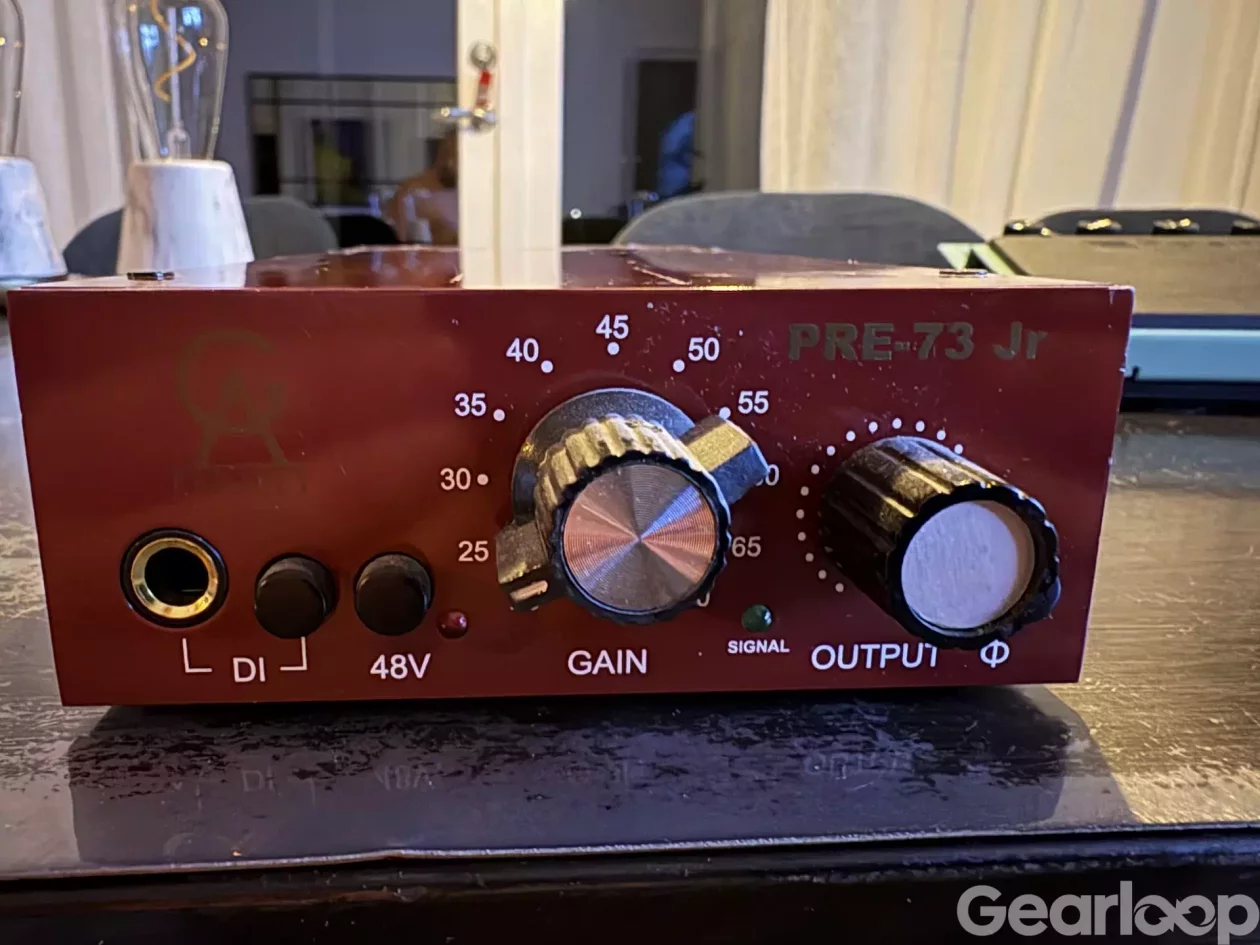 Golden Age Project PRE-73 Jr mikrofonförförstärkare i röd metallkapsling. Enheten har gain- och output-reglage på fronten samt signalindikering, DI-ingång på 6,3 mm tele och strömbrytare för 48V fantommatning. På baksidan finns kombinerad XLR/tele mic in, XLR utgång, insert-anslutning samt nätanslutning för extern adapter (AC 24V). Lämplig för inspelning av mikrofoner och instrument i studio- eller hemmamiljö.