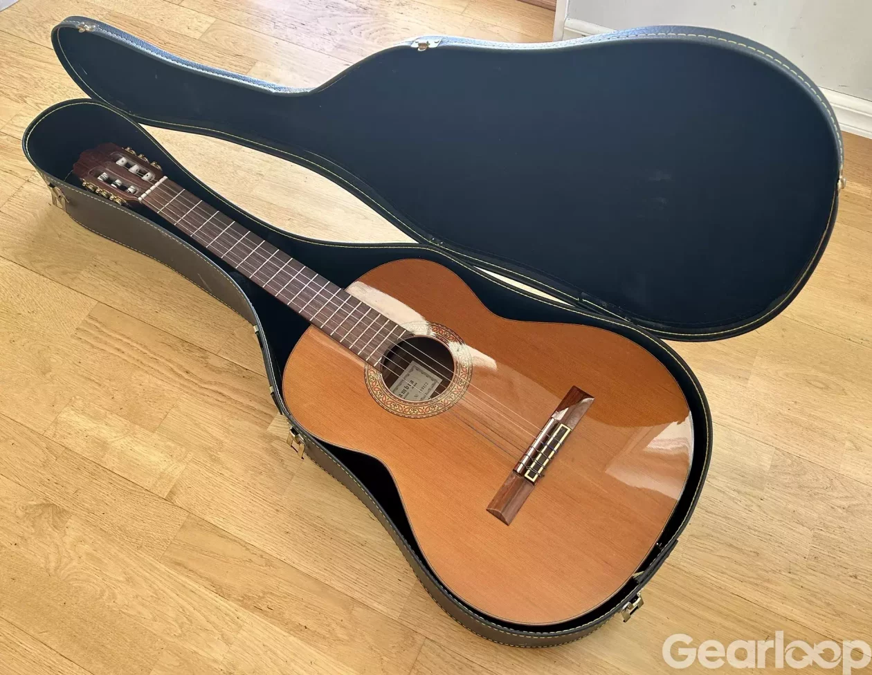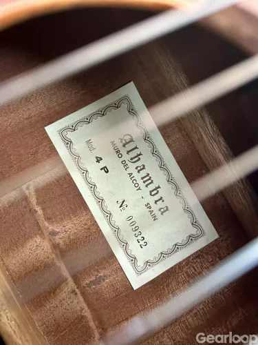 Alhambra 4P från tidigt 90-tal med original hardcase. Mycket fint skick, inget bandslitage. behöver doch nya strängar. Detra äe en klassisk spansktillverkad gitarr av hög kvalitet. Nylonsträngad med solitt lock av red cedar, hals av mahogny, sidor plus botten i rosewood och greppbräda i ebenholts. Alhambras mest sålda gitarr.